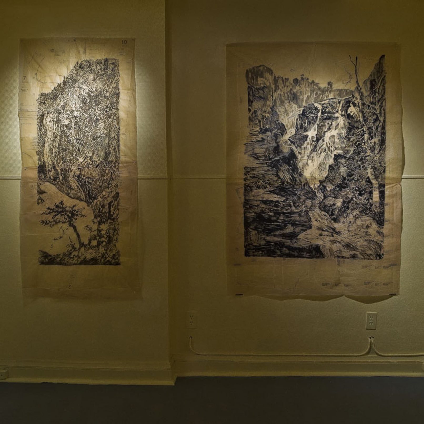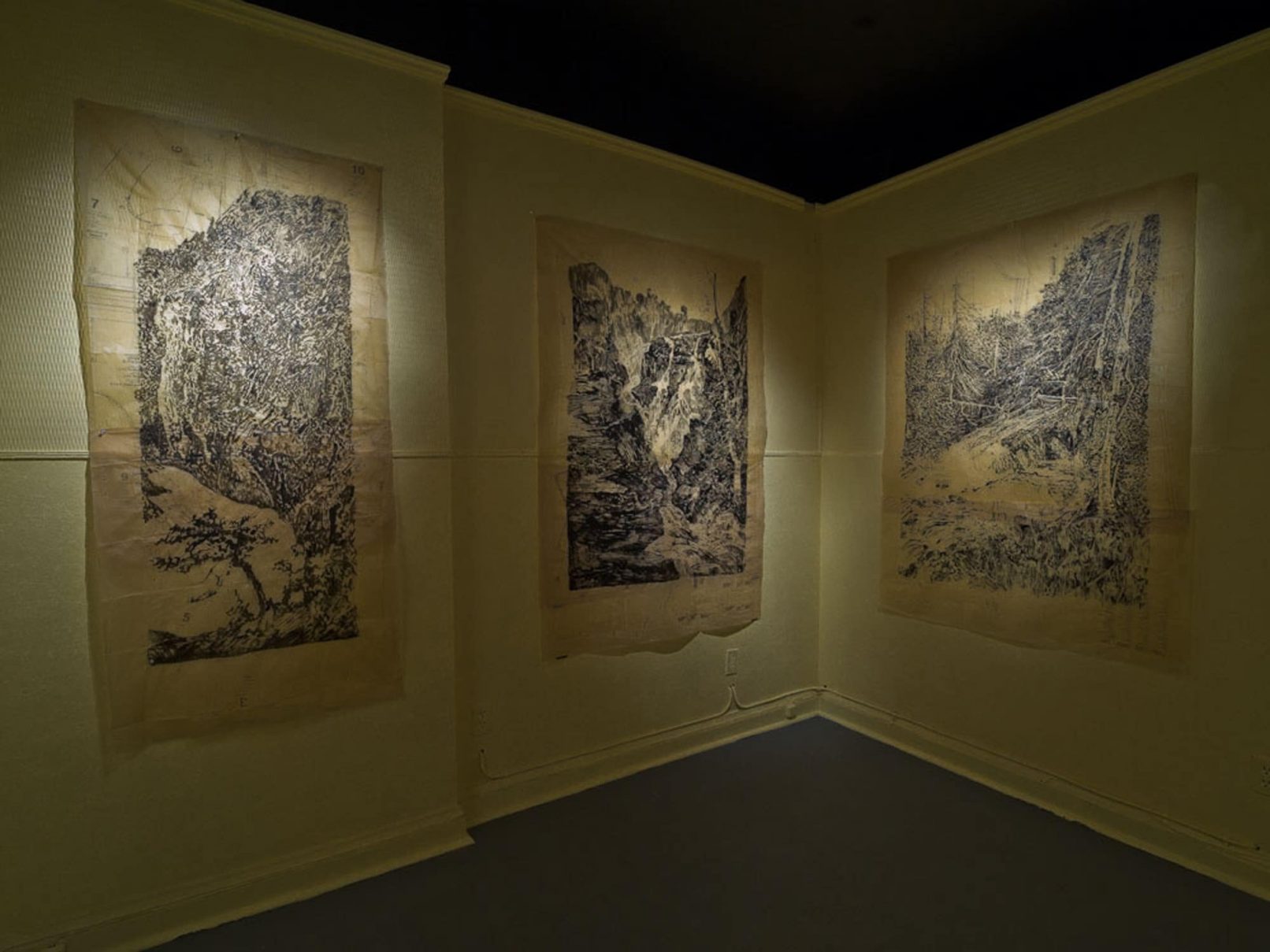 Wren alludes to Edmund Burke’s ideas of the sublime –the power to be thunderstruck by the magnitude of creation- luring the viewer into the landscape to be seduced by the beauty of nature with her brush and ink drawings.  Using old images from 19th-century etchings, Wren subtly introduces the human element by working on dressmaker’s patterns. The trace of the body is revealed, folded into the landscape through the use of the contour lines in the pattern pieces. In the sublime, humanity stands in the centre of the landscape to observe nature’s beauty and horror. Through the omission of the figure, Wren underscores the power of the sublime landscape.