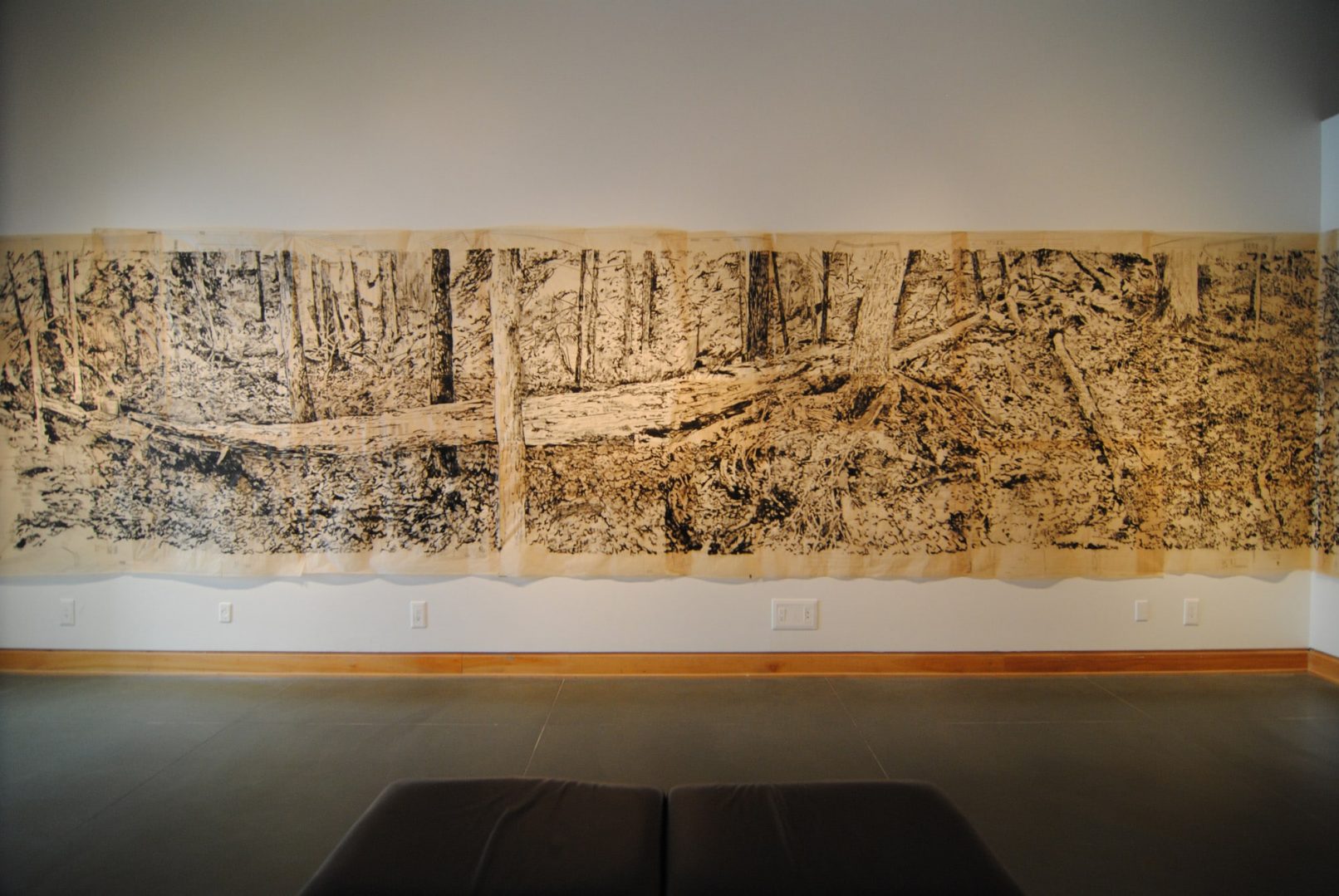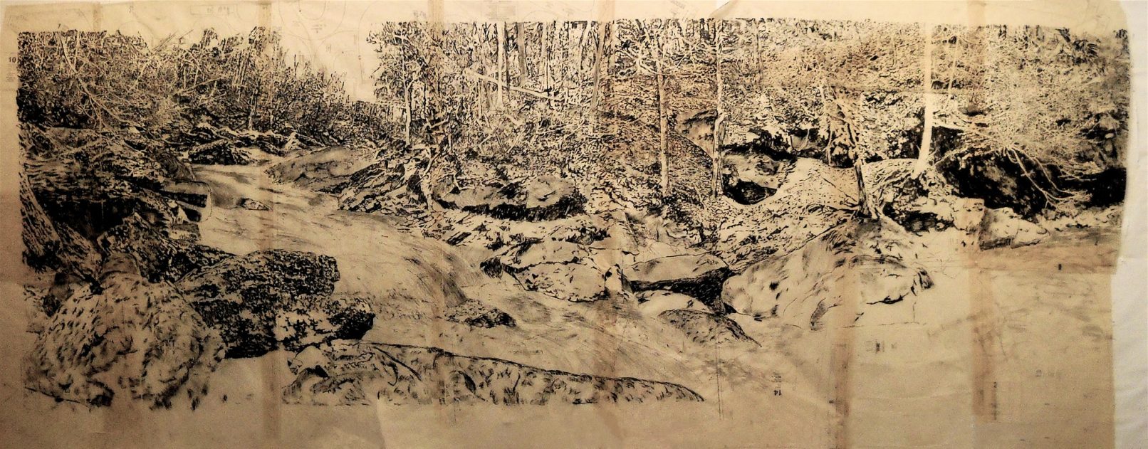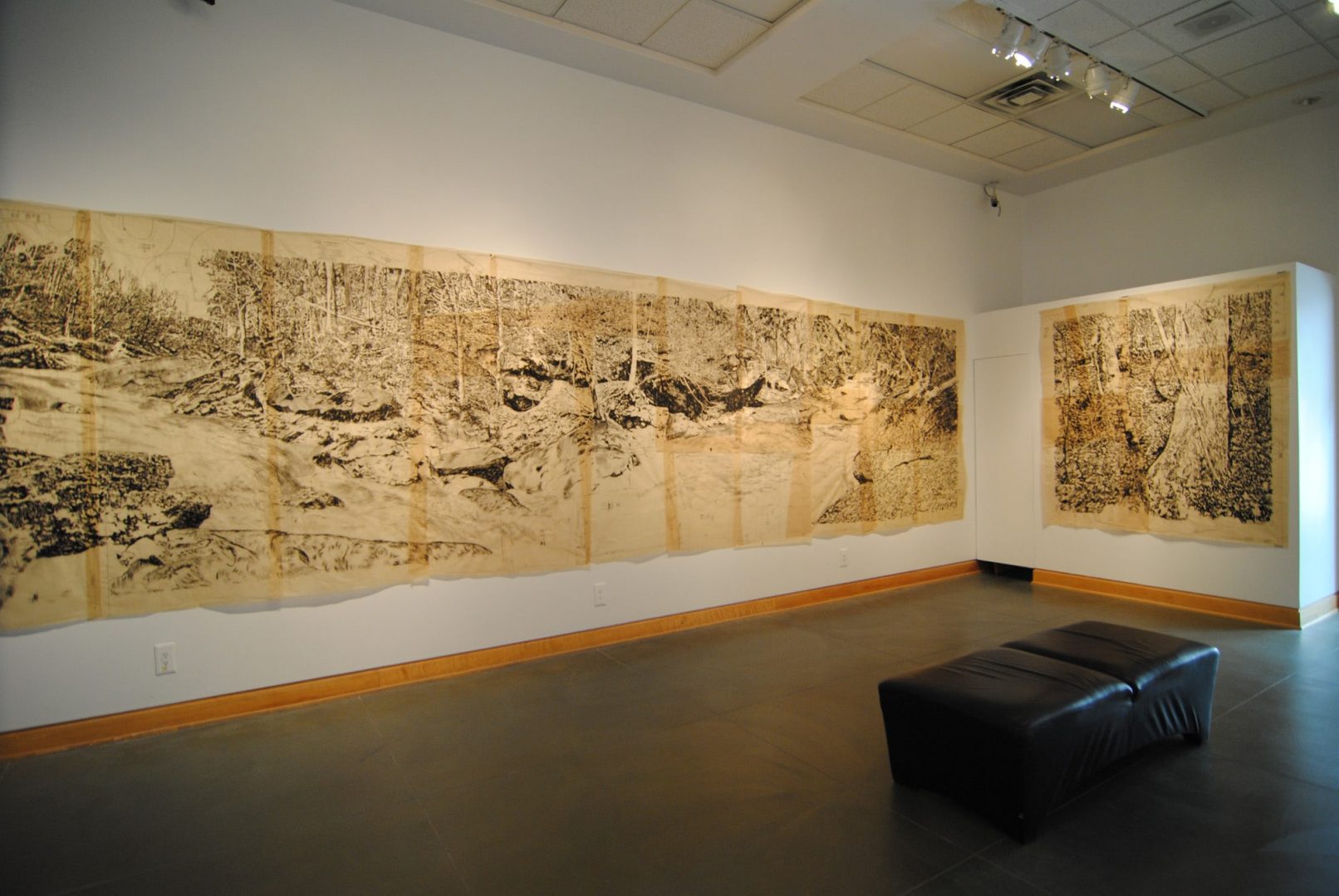 Using tissue paper dress patterns that have outlines of the fabric pieces to be cut, and marks where darts are to be sewn, and the grain lines where fabric is to be lain, Wren wrapped the gallery walls as though they are bodies being fitted. Her imagery is the Romantic landscape, rendered in brush and ink in an old-fashioned, topographic approach, referencing the popular panoramic exhibitions of the late nineteenth century and the beauty and terror of the sublime.