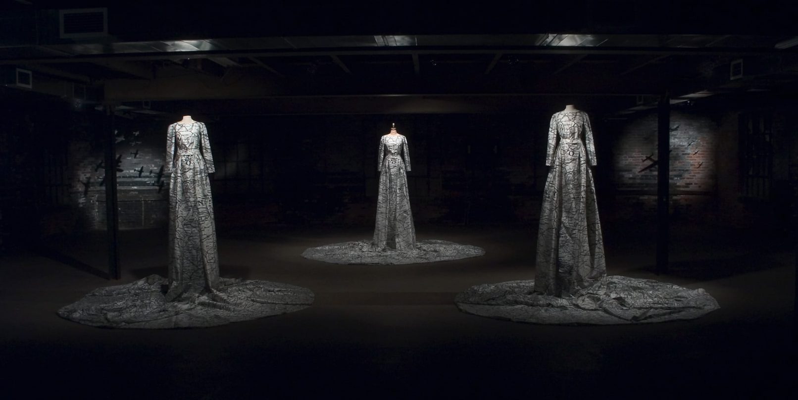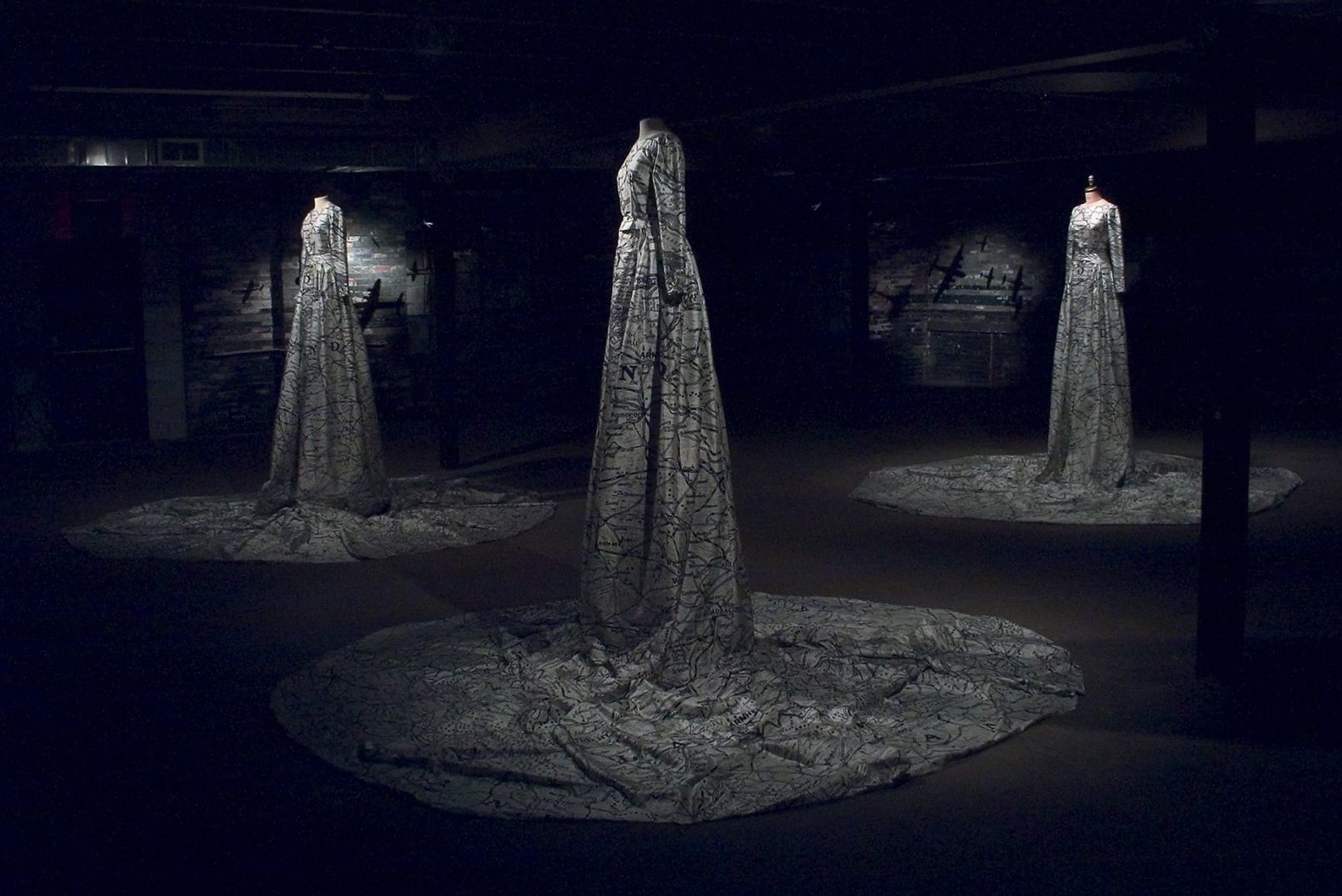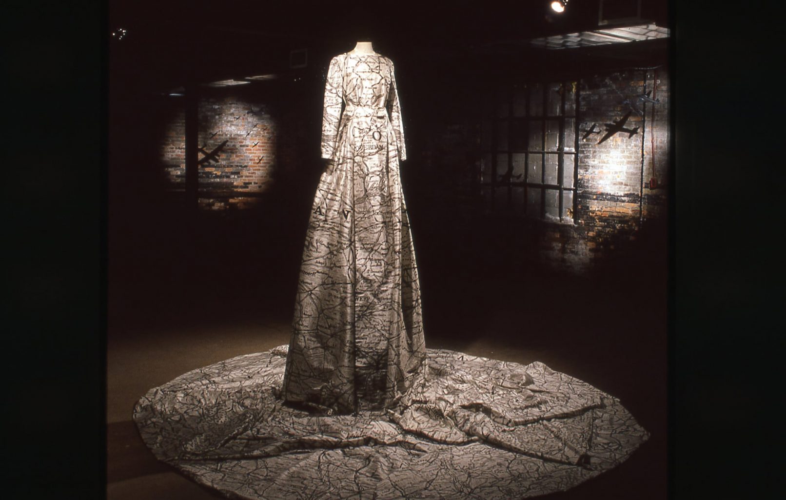 The ingenuity of Christopher Clayton Hutton’s invention of silk maps for the British Royal Air Force during World War II enabled pilots to use lightweight and durable maps to help them reach safety in times of crisis, and inspired women to make dresses out of the silk maps as their men returned home. The maps used by Wren in the dresses were made in Europe by the Canadian government and shipped to Canada for families to follow the movements of their loved ones fighting in the war. Alluding to multiple layers of symbolism of the landscape in relation to the body, and reflecting on war and the politics of Feminism (viewpoint, memory, and identity), The War Map Dress Trilogy is more about history, location, distances, than it is about terrain.