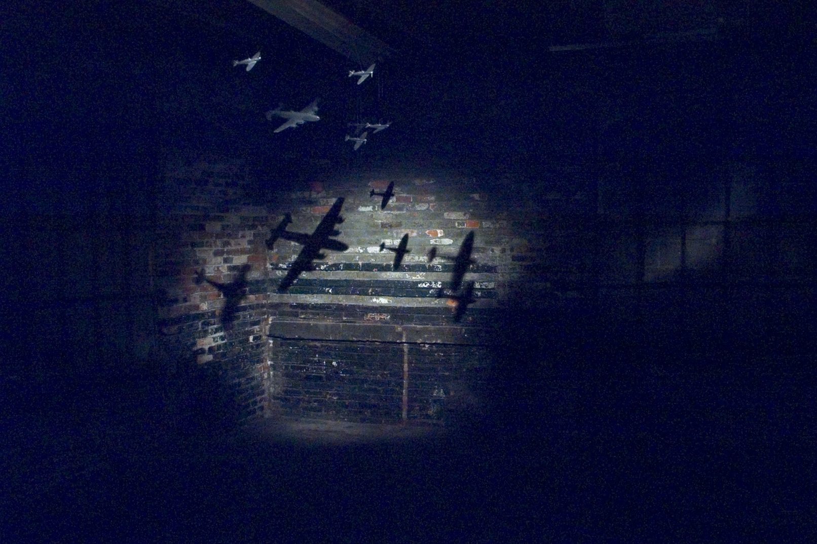 Lino blocks, hand-printed on Dupont silk, thread, zippers, mannequins, model airplanes, black paint.